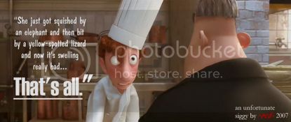 I really like the Incredibles ones. JF, tell your friend that she did a wonderful job with it! Although, some of the text is a little hard to read, I still found them very enjoyable. I really like the meatloaf one. Really funny. I can’t wait for more TI stuff. Give her my complements.