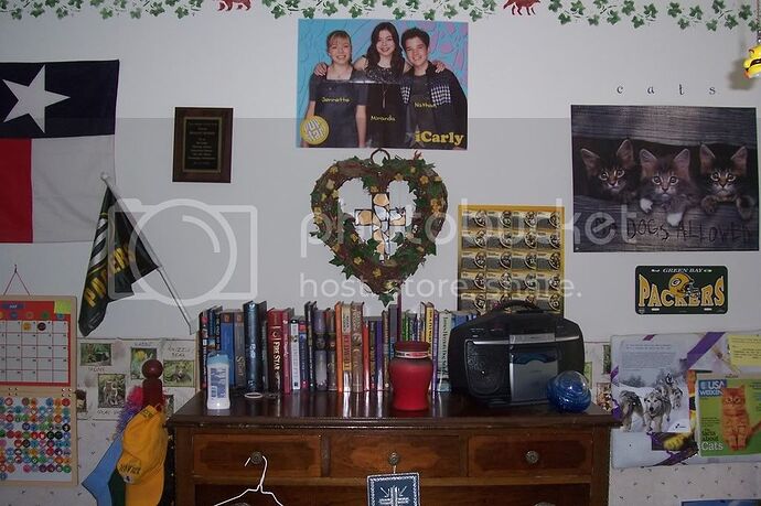 my dresser with my book collection. iCarly poster, heart wreath, Texas flag.
