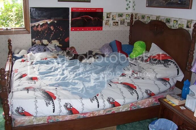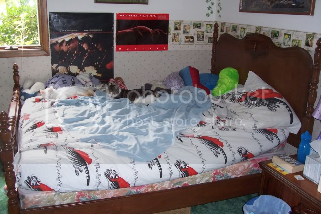 my bed. not made, as usual. In the back next to all the stuffed animals are my two cats, Hank and Buster. I luv my superkitty sheets!