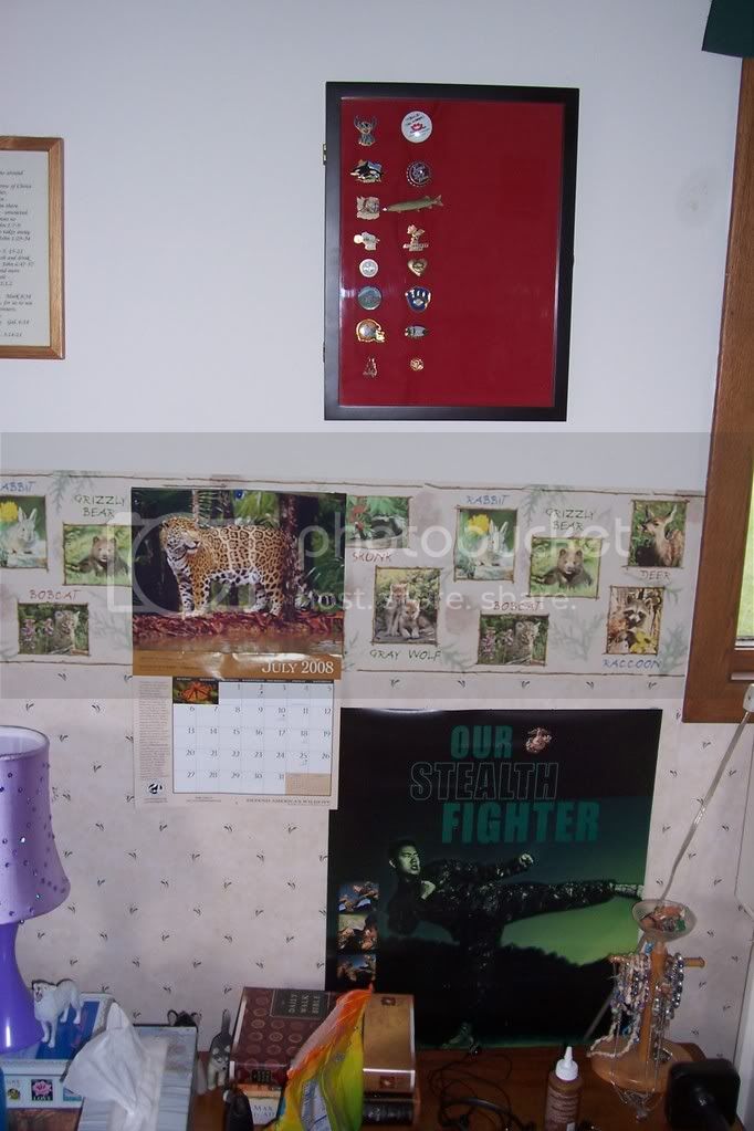 my wall above my cedar chest. pin collection. marine poster. animal calendar. Used to have a big “Cars” movie poster there, but I took it down in order to put up my pin collection.
