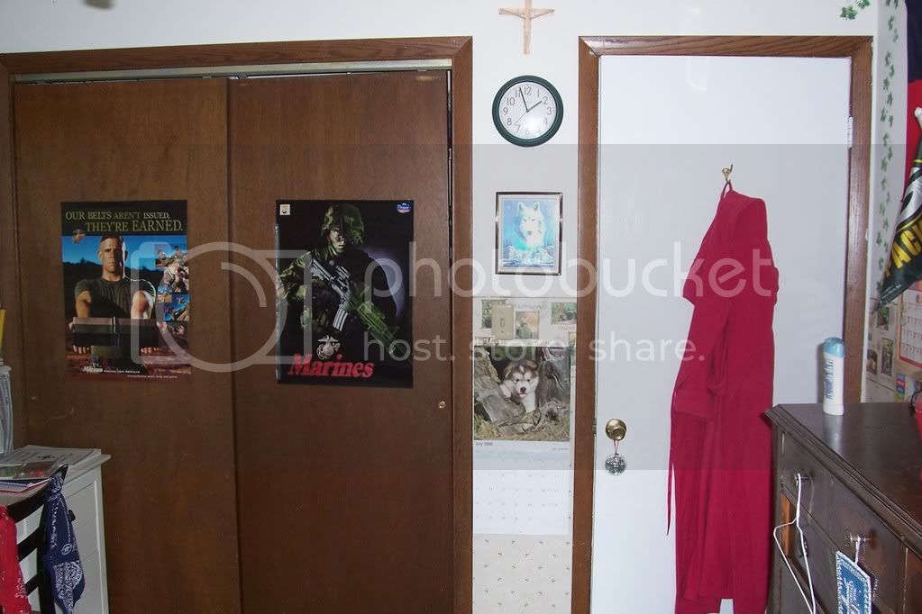 wall #1. back of door, closet door. marine posters. Husky calendar.