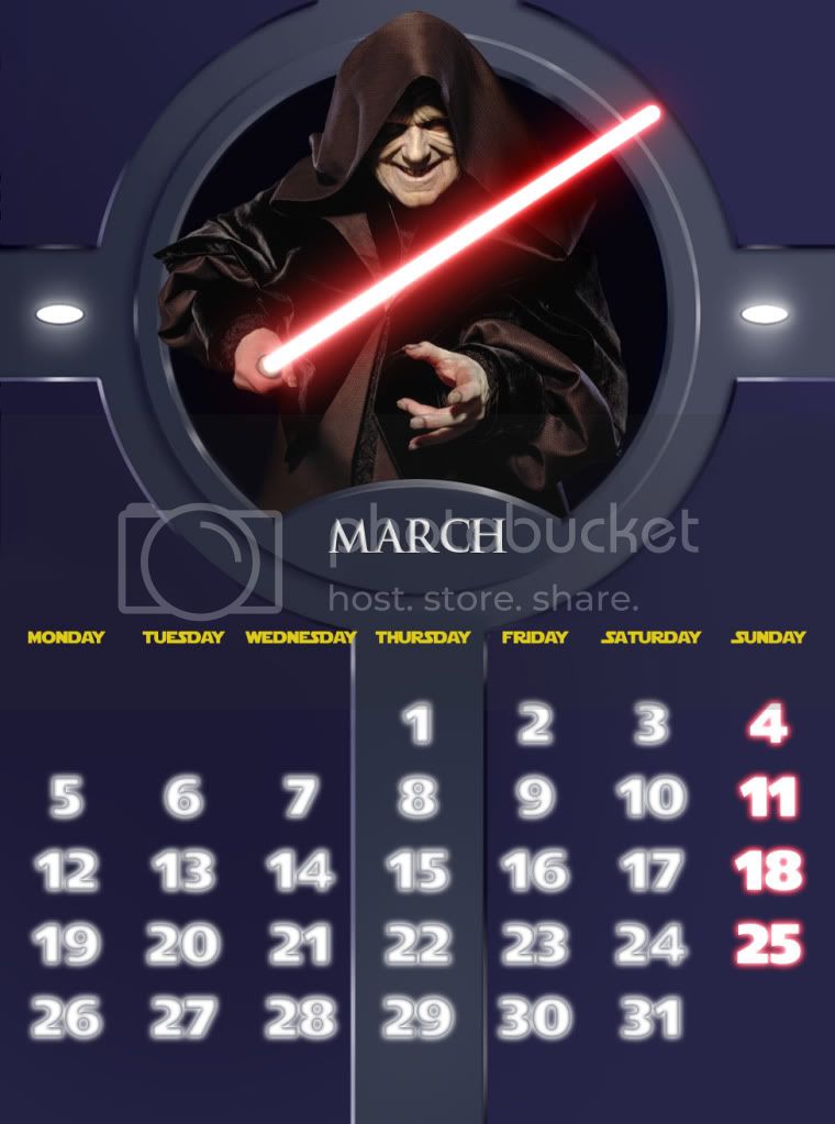 March represents Episode III, and the planet where most of that films happens, Coruscant, and particularly the Senate, where the final duel between Palpatine and Yoda takes place. This month was intentionally made as a counterpart of February.