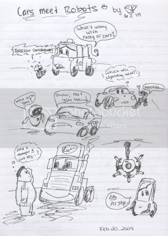 But I’ll probably get the picture done today or tomorrow, so I’ll scan it (when I can get on the computer) and stuff. Ultimately, I would love to color it in on the computer, but due to the fact that I don’t currently possess Photoshop (and my computer coloring skills are horrible to boot!), I’ll probably hold off on it… unless, if someone really talented in computer painting falls in love with the drawing, maybe they would do it for me…? (The colors would be easy to find… all you need to do is look up the movie poster.
