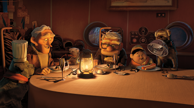 Update on Up in-jokes. Just finished watching the commentary. Pete and Bob admit to recycling a lot of the setpieces for Ratatouille during the dinner scene, most notably the silverware and the actual food on their plates.