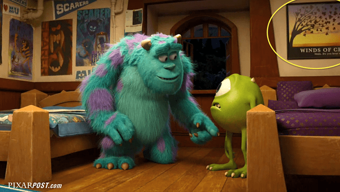 Don’t know if this was mentioned yet, but in Monsters, Inc, when the one monster runs out of the room crying, you can see the Paul Bunyan poster from Sid’s room on the wall.