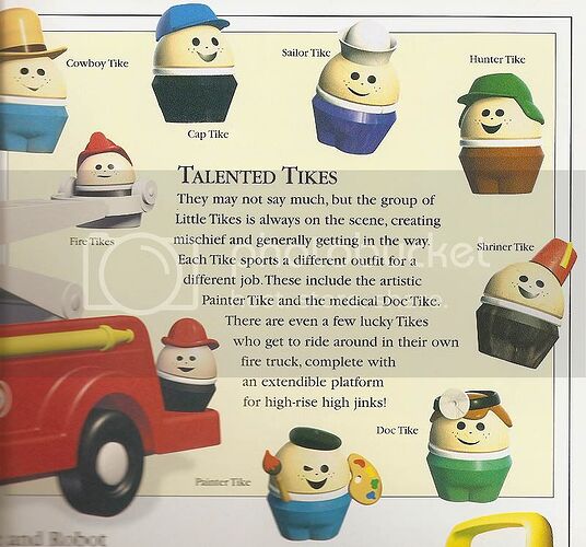 Firefighter tikes, cowboy, doctor, dark blue cap, hunter hat, black haired, and religious tike in these pictures. Also the firetruck.