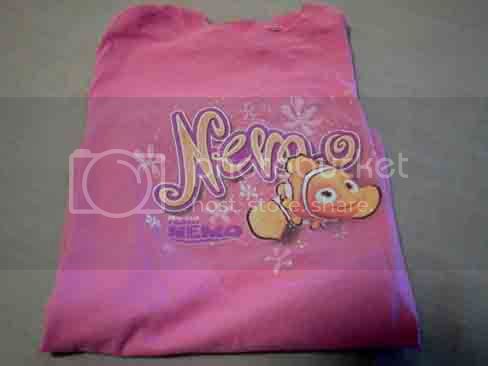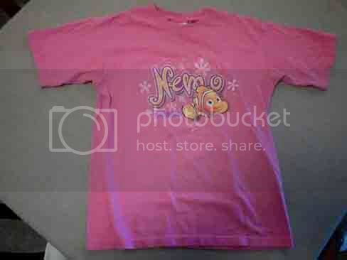 Description: I bought this Finding Nemo t-shirt some time ago at a local Disney Store in my area. It is practically in prime condition (there are a few small stains on the bottom of the shirt, but they’re barely noticeable; I’ll see if I can wash them out) and has only been worn once or twice! It is a pink shirt with an image of Nemo on the front and some text that says “Nemo”. It is a girl’s size medium – perfect for your younger sister or little daughter!