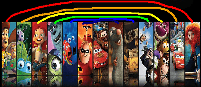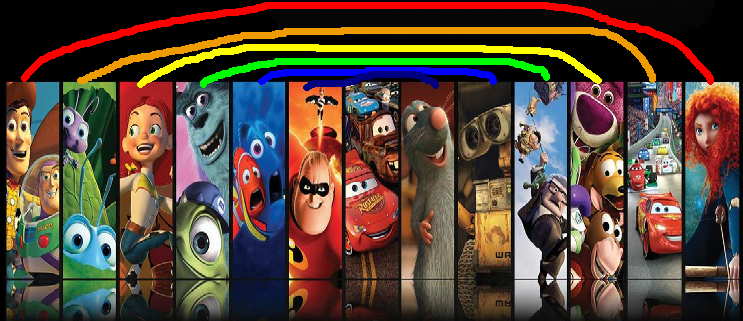 I noticed this a while ago, but if you put the Pixar films from Toy Story to Brave in chronological order, you could make a sort of “rainbow” pattern over them connecting each film with some sort of similarity. (I’ve included a visual aid as well.)