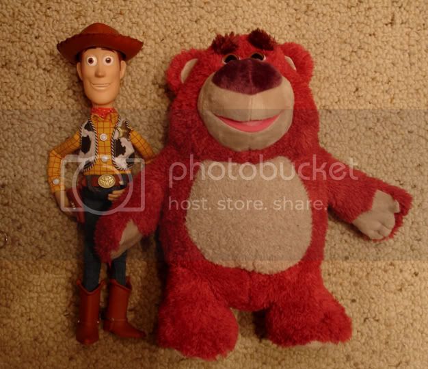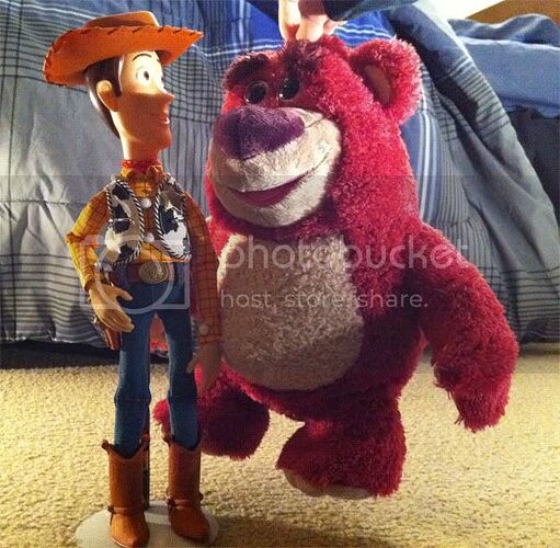 Wow, guys, me and another poster over at sideshow just discovered something. not all TSC lotso’s are the same height. I assumed all of them were too small to be in scale. in this pic of mine I show how big he would need to be in order ot be in scale with woody.