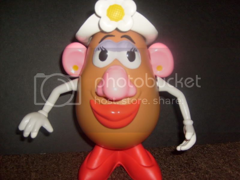 I did some editing to the Toy Story Mrs. P!! I still plan to make her a smaller nose out of clay. But so far I cut off those retarded eyelashes and I repainted her eye lids and pupils it makes a great differance!! I also painted on some eye brows and fixed the hat to sit farther back. I plan to make clay yellow balls for her earings and a smaller nose. Over all i’m pleased with the change!!