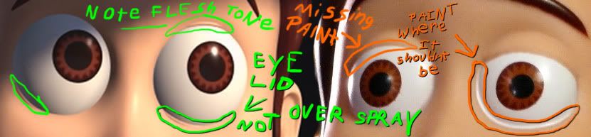 It may not look as “bad” on film, but you can see that Thinkway did the paint on the eyes on purpose. I have seen the paint being very consistant with that overspray in that area.