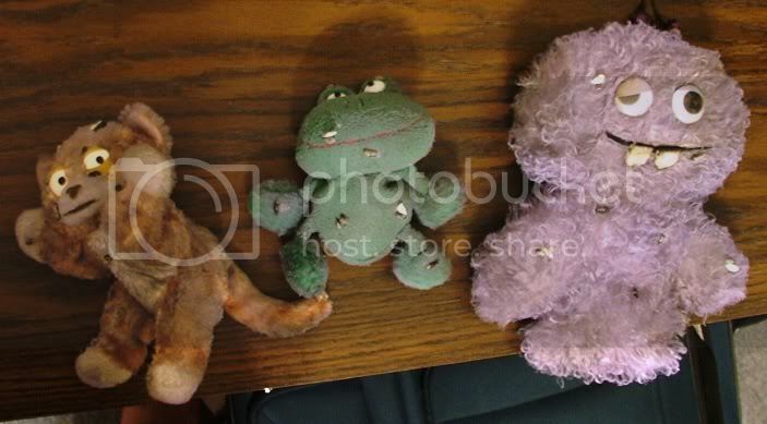 All three were roughed up with spray paint and had sculpey bugs glued to them. The cat also got a new set of eyes to better match the movie, and the furry puppet is made from scratch. Couldn’t find purple fur, so I made it from white and spray painted it lavendar.