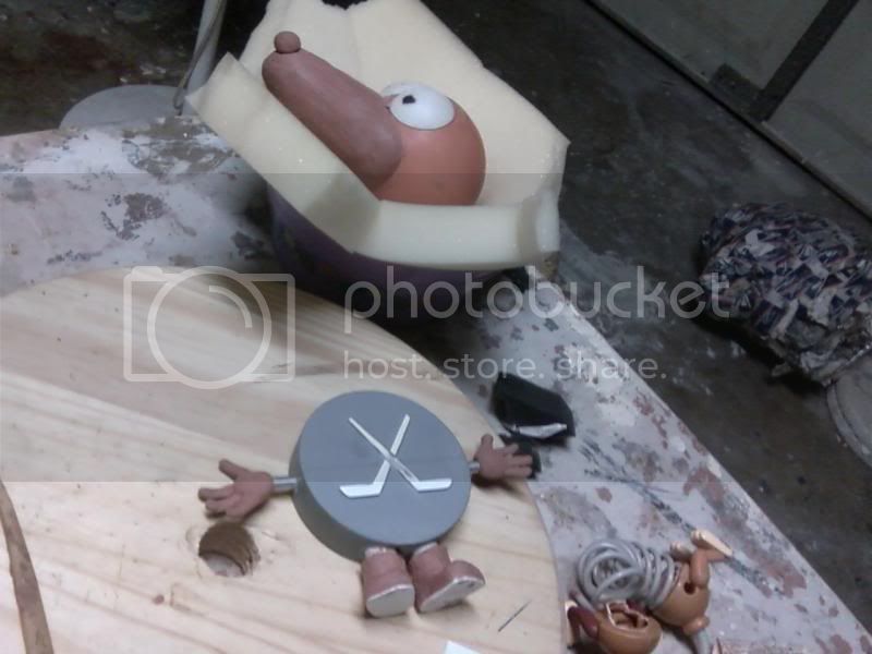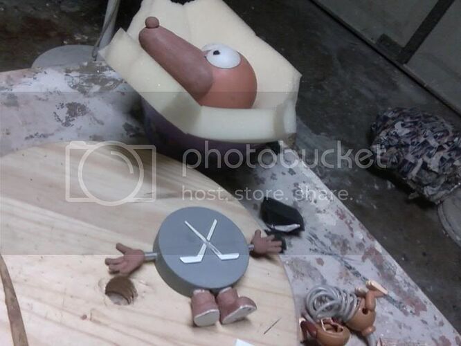 Here are his arms (everything is scratch except for of course the 7/32 aluminum pipe, and the 1/2" dowel pieces used for his legs. This is still a WIP, so thast why it looks like a robot, rather than the character on screen. The “robot” looking hands are for the clay to grab on to, and to keep the fingers, hands, the same size, as with the feet. (A tip for sculptors: spraying air duster upside produces a cold spray that can be used to crisp up clay/make it hard. Fine grit sand paper can then be used on the “frozen” clay to get any smooth planes and angles you wish)