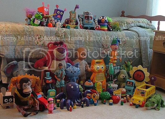 I added four toys to Sunnysideā¦mainly to have the toys needed to try and copy the setup for the line āNew Toys!āā¦the pic isnāt great, but I like that most of the people are thereā¦and of course Bonnieās toys are now omplete with Chuckles. Its funnyā¦Trixie ended up too small, and Chuckles ended up too bigā¦but its all good.