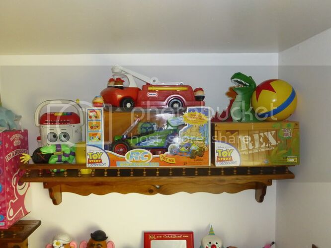 Rex, pixar ball, mr mike, hockey puck, yellow barrel, hockey puck, RC, Little tykes firetruck