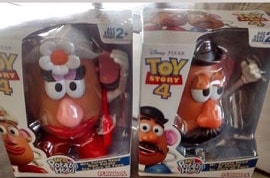 Hey guys! A few pictures are making the rounds on Instagram…Of new Toy Story 4 Mr. and Mrs. Potato Heads by Playskool! It’s basically the newer potato body (the model they’ve been using since 2011) with newly-sculpted eyes, mouth, mustache, and nose, and the old hat, shoes, and arms. I think the newer potato bodies somehow lend themselves better to the movie potato heads’ proportions than the older, longer bodies do, especially since the arms can be set lower on the body. Even though Mrs. Potato Head’s eyelashes are huge for no conceivable reason, I think with some added eyebrows and swapped ears these could look really good, and close to movie-accurate even with the single eye pieces. If the people who took these pictures are on here, please make yourselves known. Those sharing these have been pretty tight-lipped about where they got these pictures from, but the packaging is consistent with early sightings of the new Toy Story 4 editions of the Woody and Buzz-themed Mr. Potato Heads.