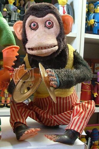 Here are a couple of pics of my monkey. He is in really bad condition. Well worn and stained, and the batteries had rotted out…so he does not work. However, I find that the worn nature of him works well for the character and his location…and I only paid seven dollars for him…which was a steal compared to the other auctions at the time…and some of those higher priced monkeys were in worse condition than this.