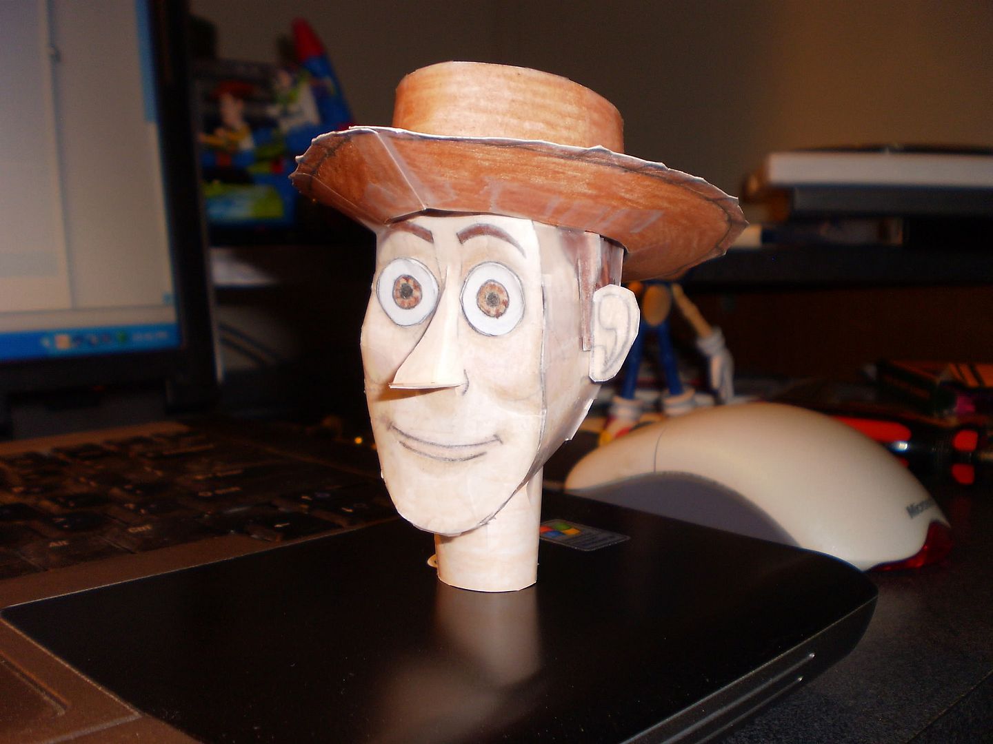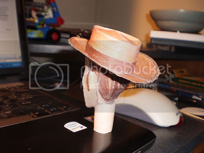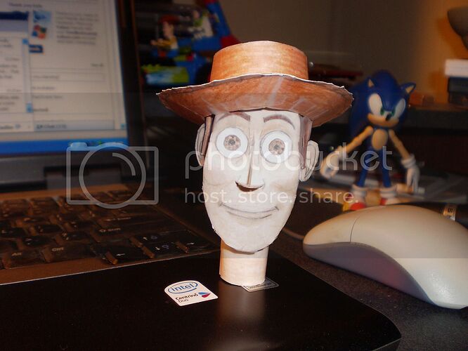 Incidentally, I am working on a custom paper model of Woody, but as I’m designing it from scratch with colored pencils and tape and the like, there’s no template or anything so I won’t be able to share the design. I’ve got his head done so far: